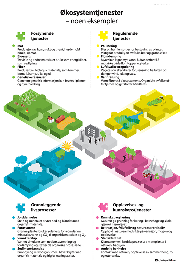 Figuren illustrerer økosystemtjenester. Det skilles mellom forsynende tjenester, regulerende tjenester, grunnleggende livsprosesser og opplevelses- og kunnskapstjenester.