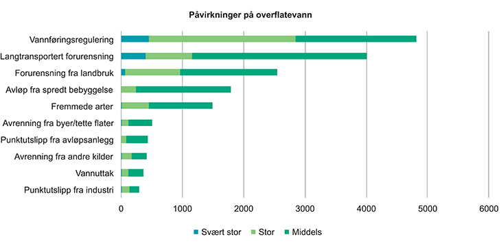 Inngrep i form av veier, drenering (ikke bare knyttet til landbruk, men generelt) og igjenfylling påvirker spesielt mindre vannforekomster (dammer, bekker), og har ført til at mange slike forekomster har forsvunnet eller blitt mer isolert. Påvirkning i form av forurensning omfatter punktkilder, diffus avrenning og langtransporterte forurensninger som bidrar til forsuring, overgjødsling og spredning av miljøgifter. Tålegrenser for forsuring av ferskvann er overskredet for minimum åtte prosent av Norges landareal. Det er særlig områder på Sør- og Vestlandet som er påvirket av forsuring. Innenfor jordbruk, kommunalt avløp og industri har det vært gjennomført en rekke tiltak for å redusere utslippene av næringssalter de siste 20–30 årene. Dagens utslipp er likevel så store at de har betydning for vannkvaliteten. Jordbruk og avløp er viktige kilder for overgjødsling i elver og innsjøer. Innsjøsedimentene i store deler av Sør-Norge er forurenset av bly, kvikksølv og kadmium. Disse miljøgiftene er først og fremst tilført gjennom langtransporterte luftforurensninger, og tilførslene er i ferd med å avta. Det er generelt liten fare for at de nivåene som nå måles er skadelige for planter og dyr. Unntaket er kvikksølv, som viser liten endring siden 1995 og som dessuten kan oppkonsentreres i næringskjedene, blant annet med høye konsentrasjoner i ferskvannsfisk. Samtidig er det mangelfull kunnskap om mengder og biologiske effekter av nye typer miljøgifter, som for eksempel brommerte flammehemmere.