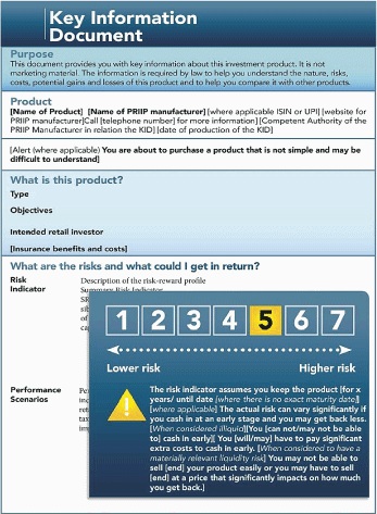 PRIIPs-forordningen om nøkkelinformasjon for investeringsprodukter trådte i kraft i EU 1. januar 2018. PRIIPs-forordningen harmoniserer informasjonskrav ved salg av sammensatte og forsikringsbaserte investeringsprodukter på tvers av bank-, forsikrings- og verdipapirsektoren, og stiller krav om at det skal utarbeides standardisert produktinformasjon ved bruk av et faktaark (nøkkelinformasjonsdokument) som skal gjøres tilgjengelig for ikke-profesjonelle investorer før det inngås avtale om salg av slike produkter. EU har også vedtatt nivå 2-regler til PRIIPs, hvor det er fastsatt supplerende regler om tekniske standarder for presentasjon, gjennomgang mv. av nøkkelinformasjon. Figur 4.1 viser eksempler på elementer i standard utarbeidet av EU for hvordan informasjonen skal presenteres.