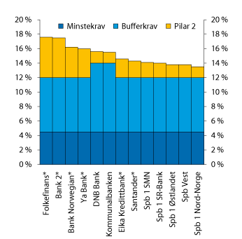 Figur 4.12 Soliditetskrav for et utvalg norske banker, uttrykt som ren kjernekapital (egenkapital) i prosent av risikovektede lån og andre eiendeler