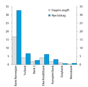 Lovendringer vedtatt av Stortinget 6. mars i år innebærer at det vil bli dyrere for forbrukslånsbankene å være omfattet av innskuddsgarantien.15 Det er obligatorisk for bankene å være medlem av den norske innskuddsgarantiordningen, og å betale årlige bidrag til Bankenes sikringsfond. Bidragene vil etter de nye reglene bli sterkere differensiert etter risiko, bl.a. slik at de mest risikable bankene må betale en større andel. Figur 4.13 viser at utvalgte banker som i stor grad baserer sin virksomhet på forbrukslån, kan få betydelig økt bidragsplikt sammenlignet med dagens innbetalingsnivå. Bidragsmodellen er ikke fastsatt ennå, og risikodifferensieringen kan potensielt økes ytterligere.