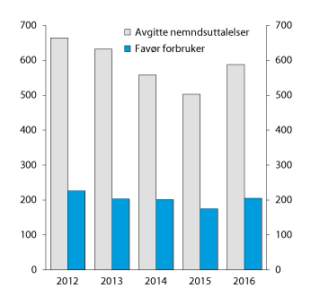 Figur 4.2 Resultat av tvistesaker i Finansklagenemnda 2012–2016. Antall saker