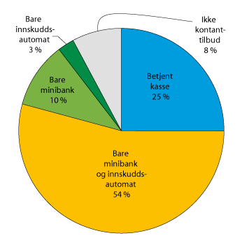 Finanstilsynets undersøkelser viser at det er bankfilialer i 298 av 422 kommuner, og at det i hovedsak er kommuner med lave innbyggertall som ikke har filialer. Banktjenester gjennom «Post i butikk» er etablert i samtlige kommuner. Bankene har minibanker på ca. 900 steder i Norge, og kontanthåndteringsselskapene Nokas og Loomis har i tillegg 323 minibanker. Minibanker er basert på fellesløsninger, slik at bankkundene kan ta ut kontanter også fra minibanker som eies av andre enn egen bank. Det er også mulig å ta ut kontanter med betalingskort i butikker i forbindelse med varekjøp, normalt inntil 1500 kroner. Dette er en tjeneste som butikkene tilbyr. Innskuddsautomatene er i stor grad forbeholdt bankens egne kunder og er langt færre enn minibankene. Muligheten til å sette inn kontanter er derfor mer begrenset enn muligheten til å ta ut kontanter, og avhengig av nærhet til betjent bankfilial, innskuddsautomat eller «Post i butikk».