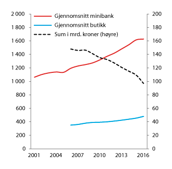 Statistikk fra Norges Bank viser at gjennomsnittlig uttak fra minibanker var om lag 1600 kroner i 2016, mens uttak ved varekjøp i butikk i gjennomsnitt utgjorde knappe 500 kroner, se figur 4.5. De samlede kontantuttakene fra disse to kildene har imidlertid falt betydelig de siste årene, fra 148 mrd. kroner i 2006 til om lag 97 mrd. kroner i 2016. Antall minibanker lå lenge stabilt på rundt 2000, men har gått markant ned de siste årene. Gjennomsnittlig antall uttak per minibank har gått ned, mens gjennomsnittlig uttaksbeløp har gått opp. Det er ikke statistikk for uttak av kontanter over skranke.
