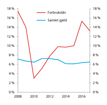 Forbrukslån er usikret gjeld til personkunder, og omfatter også kredittkortgjeld. Markedet for slike lån har vokst kraftig de siste årene, se figur 4.7. I 2017 var veksten 13 pst. Til sammenligning har den samlede gjeldsveksten i husholdningssektoren ligget nokså stabilt på vel 6 pst. En stor del av veksten i forbrukslån kommer fra spesialiserte forbrukslånsbanker som i hovedsak har blitt etablert de siste ti årene.