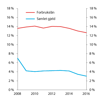 Rentene på forbrukslån varierer mye, men er oftest langt høyere enn på andre lån til husholdninger. Ifølge Norges Bank har gjennomsnittsrenten på forbrukslån ligget stabilt rundt 13–14 pst. siden 2005, se figur 4.9. Gjennomsnittsrenten på forbrukslån trekkes ned av kredittkortgjeld som ikke er rentebærende, og den faktiske gjennomsnittsrenten på forbrukslån vil derfor være noe høyere. Renter på forbrukslån står for rundt 12 pst. av husholdningenes samlede renteutgifter i 2016.10