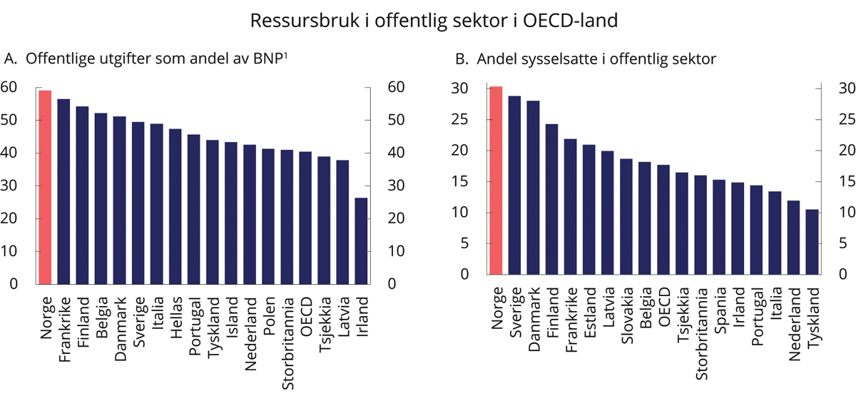 Når offentlig sektor legger beslag på en betydelig del av ressursene i økonomien, kan det også fortrenge privat sysselsetting. I 2019 utgjorde offentlige utgifter i overkant 60 pst. av fastlands-BNP. Dette er høyere enn andre OECD-land, se figur 10.1A. Koronapandemien har økt utgiftsandelen ytterligere til 66 pst. i 2020, men denne økningen blir trolig langt på vei reversert i 2021 og 2022 etter hvert som de særskilte koronatiltakene fases ut, se nærmere omtale i kapittel 7. I perioden 2000–2019 utgjorde offentlige utgifter i gjennomsnitt om lag 56 pst. av fastlands-BNP.