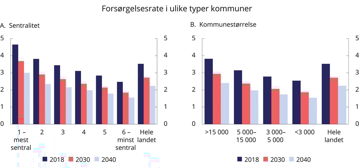 Det er positivt at vi lever lenger. Aldringen av befolkningen vil likevel bli en særlig utfordring for de minste og minst sentrale kommunene, se figur 10.3. I 2040 vil mer enn hver tredje innbygger i en del distriktskommuner ha passert 70 år. I 2018 var det for landet som helhet 3,5 sysselsatte personer per pensjonist (ikke-sysselsatte person) over 67 år. I kommuner med under 3 000 innbyggere var det kun 2,5 sysselsatte per pensjonist. I 2040 vil det være 2,2 sysselsatte per pensjonist for landet som helhet og 1,6 sysselsatte per pensjonist i kommuner med under 3 000 innbyggere. I om lag ti kommuner er det anslått å være like mange pensjonister som sysselsatte i 2040. Utviklingen er nærmere beskrevet i Meld. St. 5 (2019–2020) Levende lokalsamfunn for fremtiden. Inntektssystemet for kommunene skal bidra til å kompensere for ufrivillige kostnadsforskjeller mellom kommuner innenfor nasjonale velferdstjenester og tjenester av nasjonal karakter, som følge av blant annet ulik alderssammensetning.