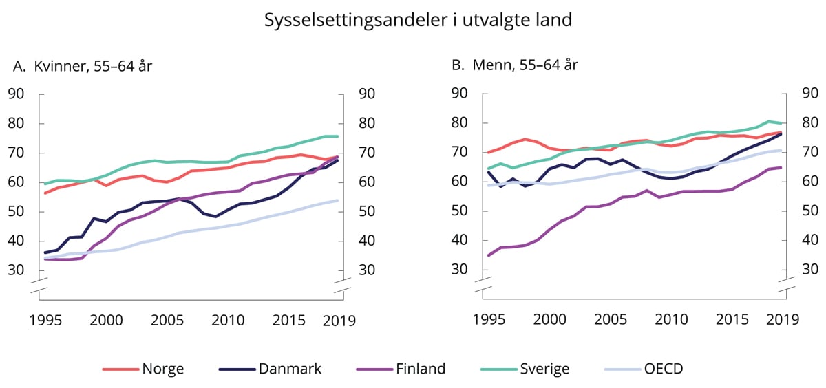 Pensjonsreformen har gjort det lønnsomt å stå lenger i jobb. Gjennom levealdersjustering har folketrygdens alderspensjon blitt tilpasset at befolkningen lever lenger. Mens en tidligere måtte slutte å arbeide for å kunne bruke tidligpensjonsordningen AFP, er denne ordningen nå i privat sektor en livsvarig ytelse som ikke fordrer at man slutter i jobb. Ny offentlig tjenestepensjon ble vedtatt våren 2019 og vil fremover gi offentlig ansatte de samme gode insentivene til å stå lenger i arbeid. Reformen vil i tillegg bygge ned mobilitetshindrene i pensjonssystemet, slik at det blir lettere å bytte jobb mellom offentlig og privat sektor.