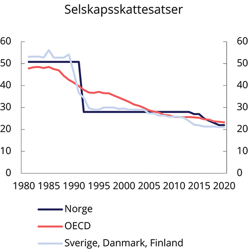 Med skattereformen i 1992 gikk vi fra et system med høye skattesatser og omfattende fradrag til et system med lavere satser og færre fradrag. Disse prinsippene er videreført i regjeringens skatteomlegging i perioden 2014–2019, der blant annet skatt på alminnelig inntekt ble redusert fra 28 pst. til 22 pst. Lavere satser og bredere grunnlag bidrar til mer effektiv bruk av ressurser.