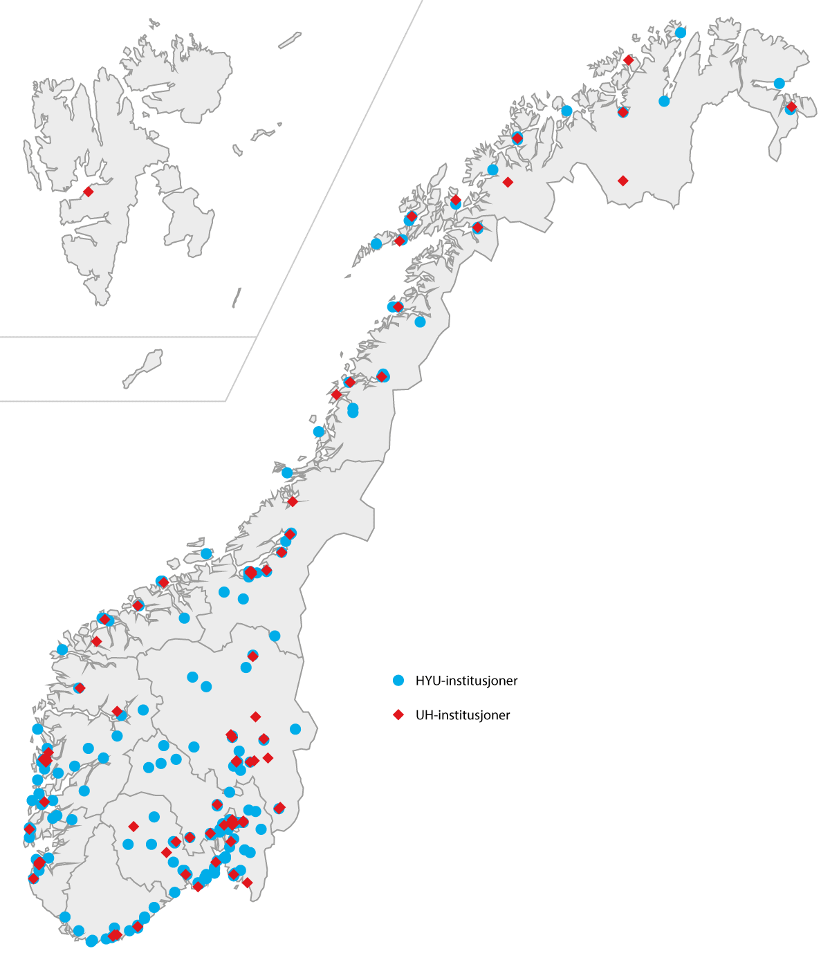 Blant de 24 statlige institusjonene ligger 21 under Kunnskapsdepartementet, mens to ligger under Justisdepartementet og en under Forsvarsdepartementet. De 25 private inkluderer institusjonsakkrediterte og institusjoner med akkrediterte utdanningsprogrammer.