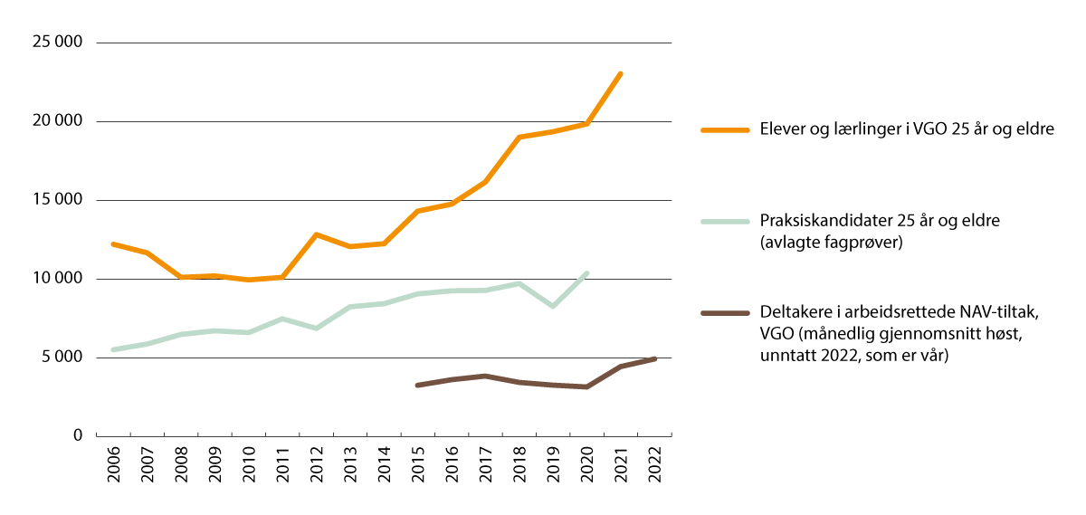 For noen fagbrev kan det vurderes om andre opplæringsløp enn 2+2-lærlingeordning kan være egnet. Som vist i kapittel 3.2.3 øker antallet som tar fagbrev i helsearbeiderfaget gjennom ordningen med vg3 i skole. De fleste som går denne veien, er voksne. Evalueringen av ordningen viser at den er populær blant både deltakere og arbeidsgivere, og forskerne hevder at det langt på vei har blitt hovedmodellen for voksne i helse- og oppvekstfagene.25 Hovedgrunnen er trolig at løpet likner på den tidligere treårige hjelpepleierutdanningen som forsvant med innføringen av Kunnskapsløftet i 2006. Den var også skolebasert med praksis i tjenestene. Helsefagarbeidere som har gått vg3 fagopplæring i skole fullfører i like stor grad, får like god tilknytning til arbeidslivet og like god lønn som voksne i ordinære lærlingeløp på to år. Tilbudet er ikke søkbart, og i utgangspunktet opprettes det bare for dem som ikke får læreplass.