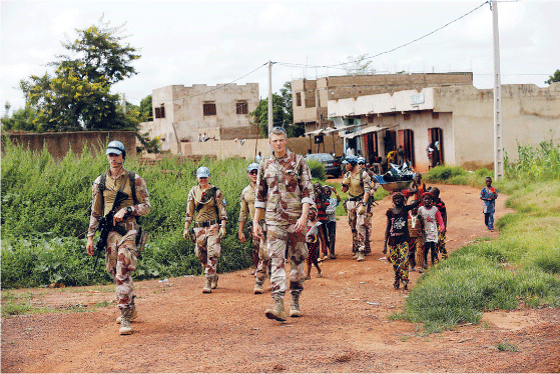 Figur 2.1 Fly Away Security Team (FAST-gruppen) på fotpatrulje i en landsby nær flyplassen i Bamako i Mali.