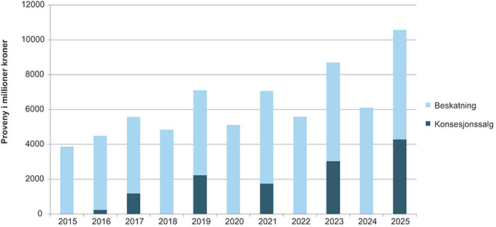 Figur 15.2 Utvikling i proveny fra beskatning og konsesjonssalg