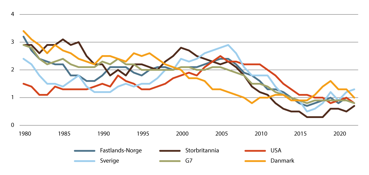 Produktiviteten i Norge er høy i internasjonal sammenheng. Veksten i produktivitet i Fastlands-Norge har de siste 50 årene vært om lag på linje med andre sammenlignbare land. Fra rundt 2006 har veksten i produktivitet gått ned, se figur 2.1. Som figuren viser er nedgangen i produktivitetsveksten en internasjonal trend, men det er noen forskjeller mellom landene. I USA var veksten lav på 1980 og 1990-tallet. Siden tok produktivitetsveksten seg opp frem til 2005 før den begynte å falle igjen. Den samme utviklingen har skjedd i Sverige. Tall for Storbritannia og Danmark viser det motsatte bildet. Den ulike utviklingen mellom land kan blant annet forklares av ulike dereguleringer til ulik tid og utvikling i næringsstrukturen. Siden 2006 har det vært mindre variasjon i produktivitetsveksten og alle landene i utvalget ser ut til å være i en lignende situasjon.