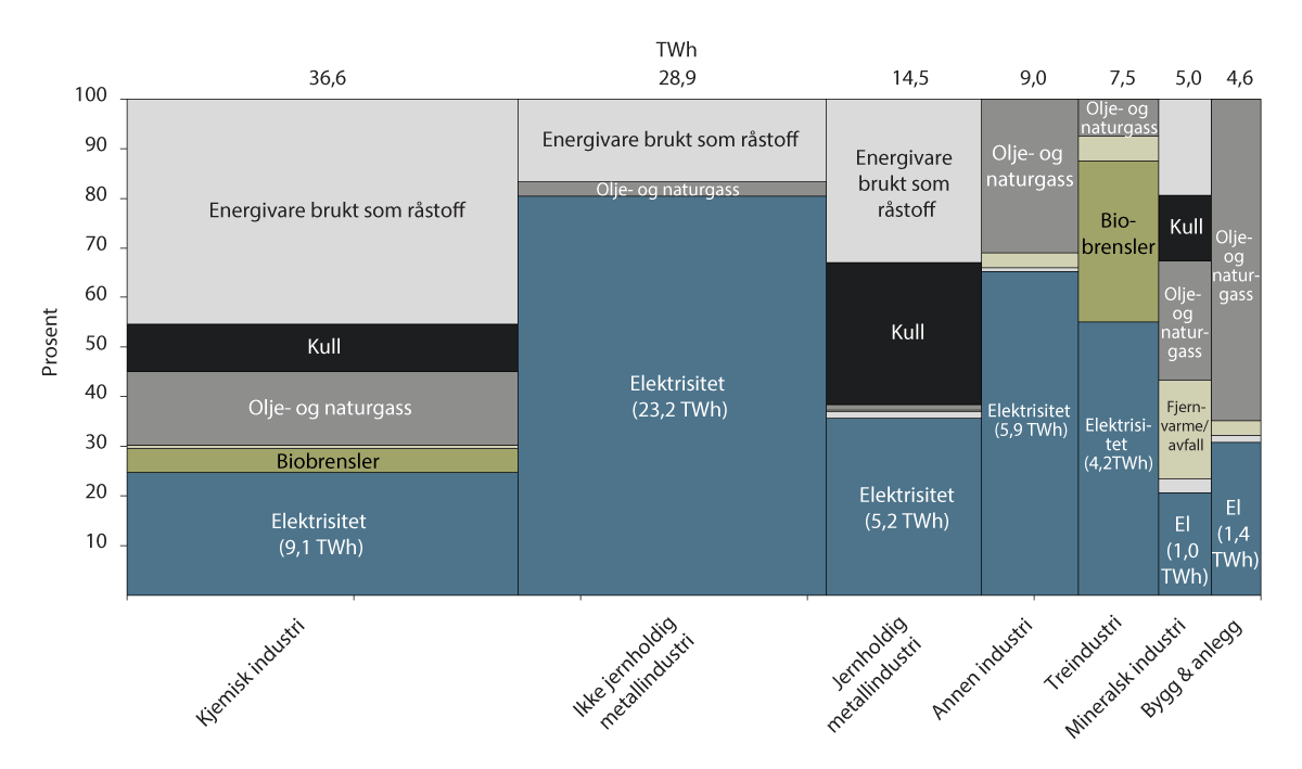 Industriproduksjon krever ofte omfattende ressursbruk i form av kraft, materialer og areal. Industrien står for om lag 30 pst. av kraftforbruket i Norge og 24 pst. av våre nasjonale klimagassutslipp. Økt konkurranse om tilgjengelig kraft kan bli en betydelig utfordring fremover. Industrien har flere særordninger, som for eksempel ingen eller redusert elavgift, frikvoter og CO2-kompensasjon.