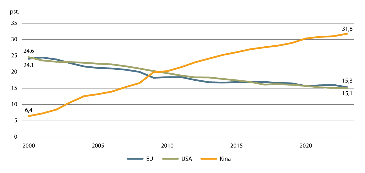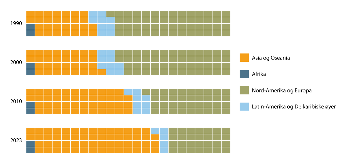 Etter at Europa og Nord-Amerika ledet an i industrialiseringens tidligere faser, har land i Asia nå tatt over som de fremste produsentene av en rekke varer. Særlig Kina har i senere år tatt dominerende posisjoner i markeder som digital og fornybar teknologi. Europa har lav økonomisk vekst, og deler av europeisk industri opplever stagnasjon eller nedgang.