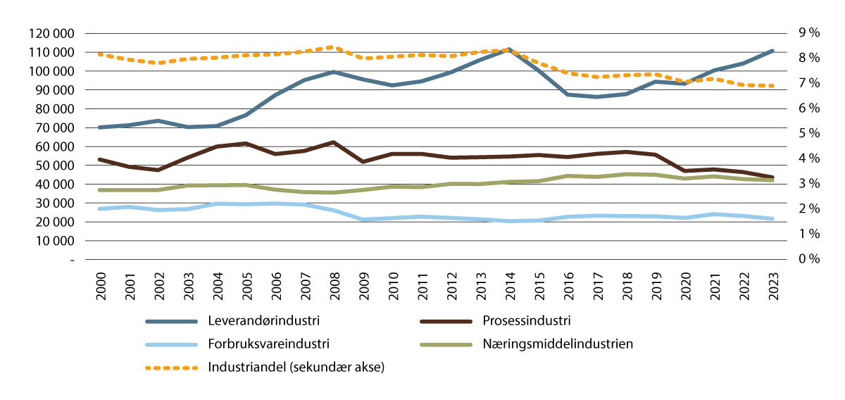 Det går godt i norsk industri. Omsetningen nådde en ny topp i 2024, hjulpet av prisvekst, og produksjonen økte etter to år med marginal nedgang. Fastlandsindustrien har kuttet utslipp med rundt 40 pst. siden 1990, og norske bedrifter er i mange industribransjer blant de mest klimaeffektive i verden. Det er samtidig stor usikkerhet om utviklingen fremover. Derfor legger regjeringen i denne meldingen frem en aktiv industripolitikk.
