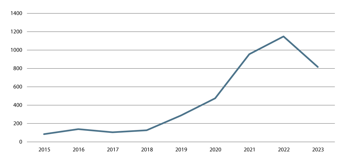 Utvikling i antall nye subsidietiltak i verden per år. 2015–2023. Figuren viser subsidier utenom eksportsubsider innført i alle land i verden, basert på egen rapportering. Kilde: Global Trade Alert.