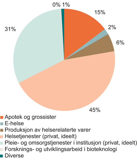 Private tjenesteytere utgjør den største delen av helsenæringen, jf. figur 2.1. Dette er private tjenesteytere innenfor omsorg, psykiatri, rus og somatikk, og de er delt inn i private helsetjenester og private pleie- og omsorgstjenester. Disse aktørene kan være en pådriver for innovasjon, gjennom at de kan eksperimentere med nye tjenestemodeller, innføre ny teknologi og ved at de fyller nisjer det offentlige ikke tar i markedet. Regjeringen innførte i 2015 reformen fritt behandlingsvalg. Målet er å redusere ventetider, utnytte ledig kapasitet og stimulere de offentlige sykehusene til å bli mer effektive. I ordningen kan private virksomheter som oppfyller visse krav levere enkelte spesialisthelsetjenester til en pris fastsatt av staten. Pasienter med rett til nødvendig helsehjelp i spesialisthelsetjenesten kan velge å motta helsehjelp hos de godkjente leverandørene.