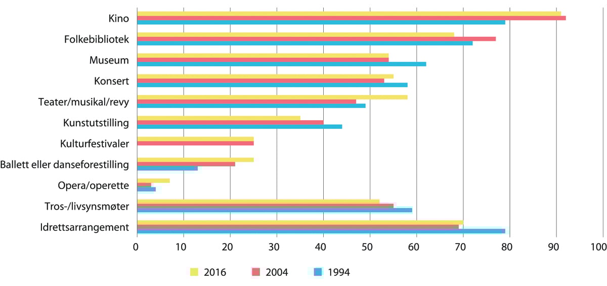 Kino er det kulturtilbodet som blir brukt mest, heile 91 prosent har gitt opp at dei har vore på kino i løpet av det siste året i den siste undersøkinga frå 2016. Undersøkinga viser vidare at dei tradisjonelle kulturaktivitetane som bibliotek og museum har blitt litt mindre besøkt dei siste åra, mens scenekunst, ballett/dans og teater/musikal/revy har trekt til seg fleire av dei unge. SSB gjennomfører ei ny kulturbruksundersøking i 2021. SSB har gått gjennom og oppdatert spørsmåla og kategoriane i undersøkinga, blant anna for å fange opp digital kulturbruk.