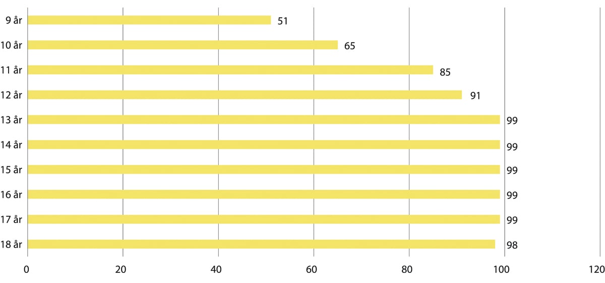 Figur 13.2 Andel i alderen 9–18 år som fortel at dei bruker eitt eller fleire sosiale medium, etter alder (N = 3353).