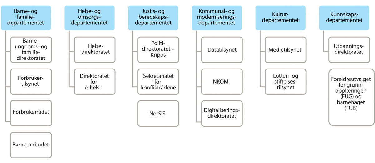 Ei rekkje departement har ansvar for politikkområde som på ein eller annan måte har med den digitale oppveksten til barn og unge å gjere: