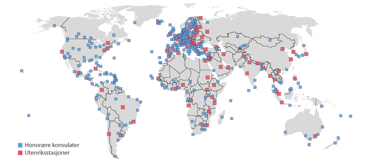 Norge har diplomatiske forbindelser med 196 land, og er våren 2025 representert med ambassade eller generalkonsulat på 82 lokasjoner i 75 av disse landene.9 Norge har i tillegg ca. 300 honorære konsulater i 125 ulike land, og disse er en viktig del av den konsulære infrastrukturen.