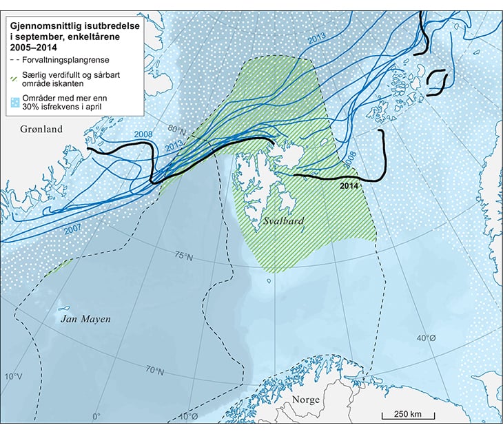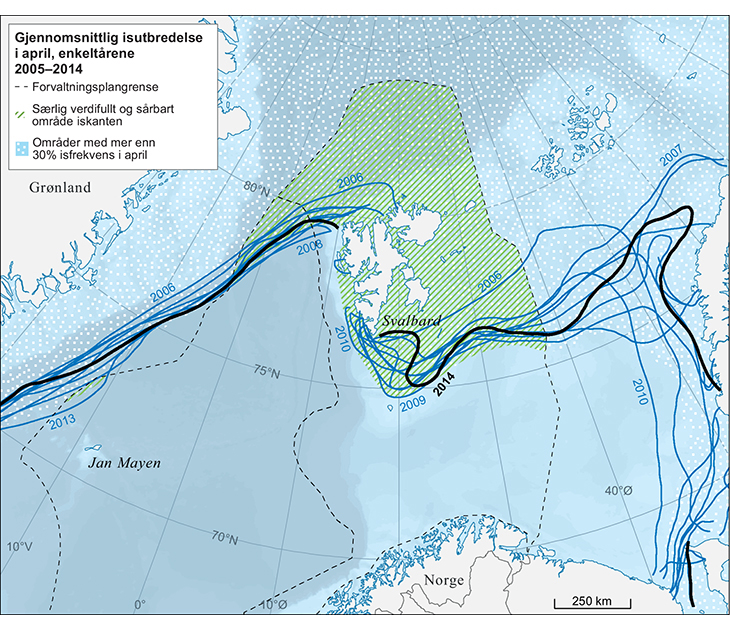 I forvaltningsplanen er iskanten som særlig verdifullt og sårbart område avgrenset ved hjelp av en statistisk fremstilling av satellittobservasjoner for en rekke år av havisens varierende utbredelse gjennom året.
