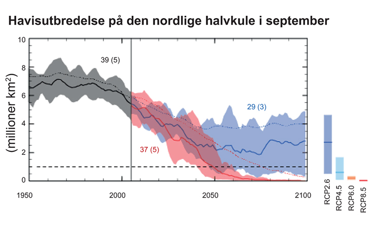 Figur 2.16 Forventede endringer i isutbredelse i Arktis om sommeren frem til slutten av det 21. århundre. Fremskrivning basert på høye fremtidige utslipp er vist i rødt, og fremskrivninger med raske og kraftige utslippsreduksjoner er vist i blått. Heltrukne linjer er fremskrevne gjennomsnittsverdier, mens de skraverte feltene angir usikkerhetsintervaller. Den horisontale stiplede linjen representerer tilnærmet isfrie forhold. Som det fremgår av figuren forventes de arktiske havområdene ved fortsatt høye utslipp å være tilnærmet isfrie i september allerede rundt midten av dette århundre.