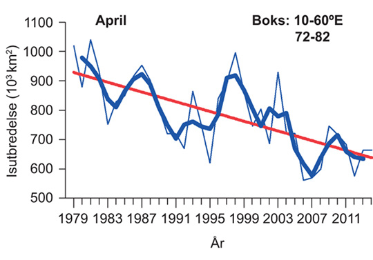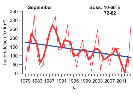 Det er de siste tre tiårene observert en klar nedadgående langtidstrend i isutbredelsen både i Arktis som helhet og i Barentshavet. I Barentshavet gjelder dette både om sommeren og om vinteren. Dette fremgår av figur 2.19 og 2.20, som viser trendene for isutbredelse i Barentshavet i april og september siden 1979, basert på satellittobservasjon. Av figurene fremgår det også at det kan være store variasjoner i isutbredelse fra år til år. Disse variasjonene skyldes naturlige svingninger, mens menneskeskapte klimaendringer antas å være hovedårsaken til den nedadgående langtidstrenden.