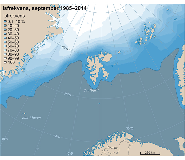 Figur 2.22 Figuren viser isfrekvensen i september måned for perioden 1985–2014. I september er isutbredelsen på sitt årlige minimum. Isfrekvensen er prosentandelen av dager det forekommer havis i et gitt område innenfor en nærmere angitt periode. Isfrekvens er nærmere forklart i teksten.
