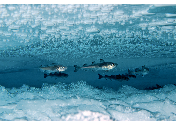 Figur 2.14 Livet i iskantsonen. Bildene viser lodde, polarmåke, isalger og ishavsåte (dyreplankton).