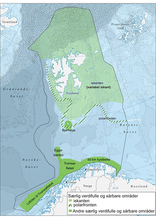 Barentshavet har flere særlig verdifulle og sårbare områder. I de nordlige delene av Barentshavet er dette iskantsonen, polarfronten og havområdene rundt Svalbard, inkludert Bjørnøya (se figur 2.8).