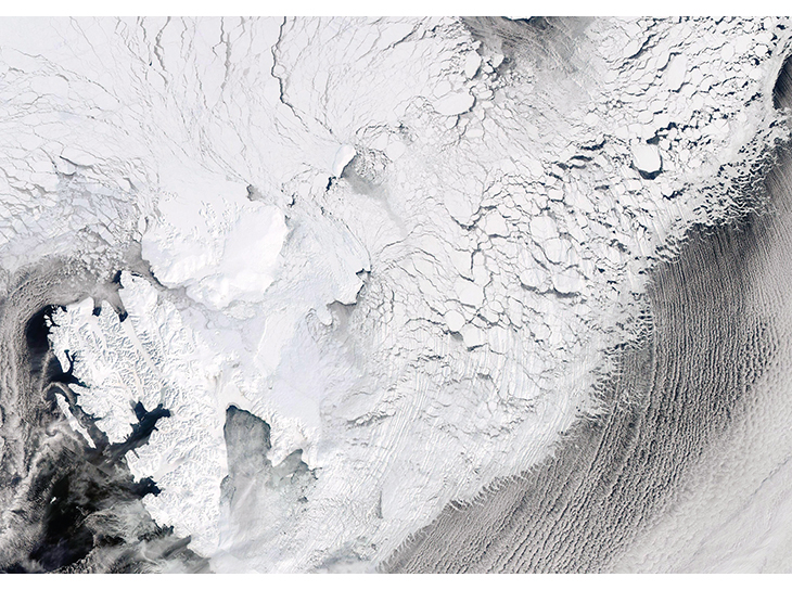 Figur 2.9 Satellittbilde av issituasjonen i området øst for Svalbard 19. april 2013. Bildet viser hvordan et system av store og små isflak og råker går langt inn i drivisen fra en opprevet ytre iskantsone. Vi ser også fastisen i noen av fjordene på Svalbard. Dette bildet viser også skyer, som kan forveksles med is.