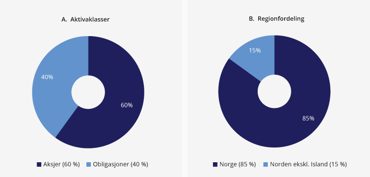 Investeringsstrategien for SPN fremgår av mandatet fra Finansdepartementet, og er uttrykt blant annet gjennom referanseindeksen og risikorammer. Den strategiske referanseindeksen for SPN er sammensatt av 60 pst. aksjer og 40 pst. obligasjoner. Referanseindeksen har en andel på 85 pst. i Norge og 15 pst. i Norden for øvrig utenom Island, se figur 4.1.