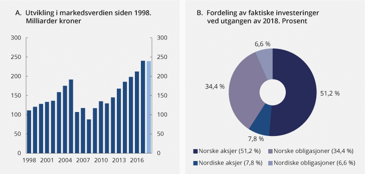 SPN hadde ved utgangen av 2018 en markedsverdi på 239 mrd. kroner, se figur 4.2A. Det er 1 mrd. kroner lavere enn verdien ved inngangen til året, etter fradrag for forvaltningskostnader. Fondets aksjeportefølje hadde på samme tid en markedsverdi på om lag 141 mrd. kroner, hvorav aksjer i norske selskaper utgjorde 122 mrd. kroner og aksjer i de øvrige nordiske landene 19 mrd. kroner. Obligasjonsporteføljen hadde en verdi på om lag 98 mrd. kroner, fordelt med 82 mrd. kroner i obligasjoner fra utstedere i Norge og nærmere 16 mrd. kroner i obligasjoner fra utstedere i andre nordiske land.2 Fordelingen av investeringene ved utgangen av 2018 er vist i figur 4.2B.