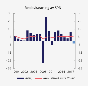Avkastningen av SPN i 2018 var -0,4 pst. målt i norske kroner og før fradrag for forvaltningskostnader, se tabell 4.1. Det var negativ avkastning i aksjeporteføljen og positiv avkastning i obligasjonsporteføljen. Gjennomsnittlig årlig avkastning av SPN har vært 7,6 pst. målt over de siste 20 år. Det tilsvarer en gjennomsnittlig årlig realavkastning etter kostnader på 5,3 pst., se figur 4.3.