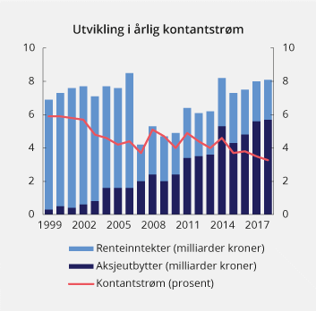 Obligasjonsinvesteringene i SPN gir løpende renteinntekter til fondet. Også aksjeinvesteringene gir inntekter, siden mange selskaper betaler utbytte til aksjonærene. Sammen med endringer i aksje- og obligasjonskurser, utgjør disse kontantstrømmene avkastningen av SPN. I 2018 var summen av aksjeutbytter og renteinntekter 8,1 mrd. kroner, eller om lag 3,3 pst. målt som andel av gjennomsnittlig verdi av SPN, se figur 4.4. De siste 20 årene har gjennomsnittlig årlig kontantstrøm i SPN tilsvart 4,5 pst., målt som andel av gjennomsnittlig verdi av fondet.