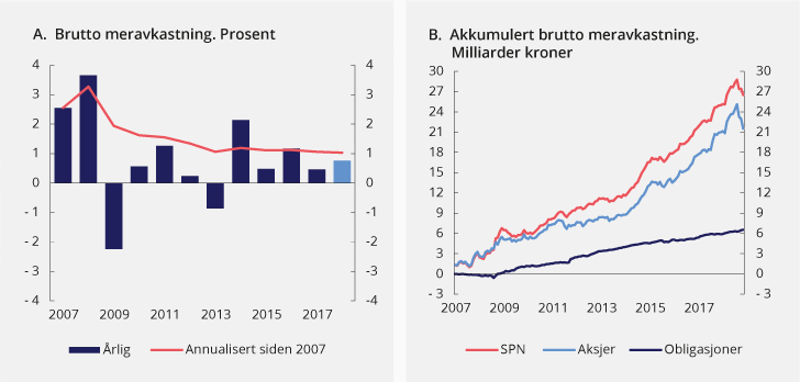 Akkumulert brutto meravkastning i milliarder kroner er beregnet som forskjellen mellom samlet kumulativ avkastning av henholdsvis SPN og fondets referanseindeks siden januar 2007, multiplisert med kapitalen i SPN ved inngangen til 2007. Beregningen angir dermed forskjellen i verdien av SPN ved utgangen av 2018 og en tenkt portefølje der kapitalen ved inngangen til 2007 forrentes med avkastningen av referanseindeksen for fondet frem til utgangen av 2018. En tidvis ulik fordeling mellom aksjer og obligasjoner i fondet, sammenlignet med referanseindeksen fra Finansdepartementet, såkalte allokeringseffekter, medfører at samlet kumulativ avkastning av SPN er noe lavere enn summen av aksje- og obligasjonsporteføljene separat.