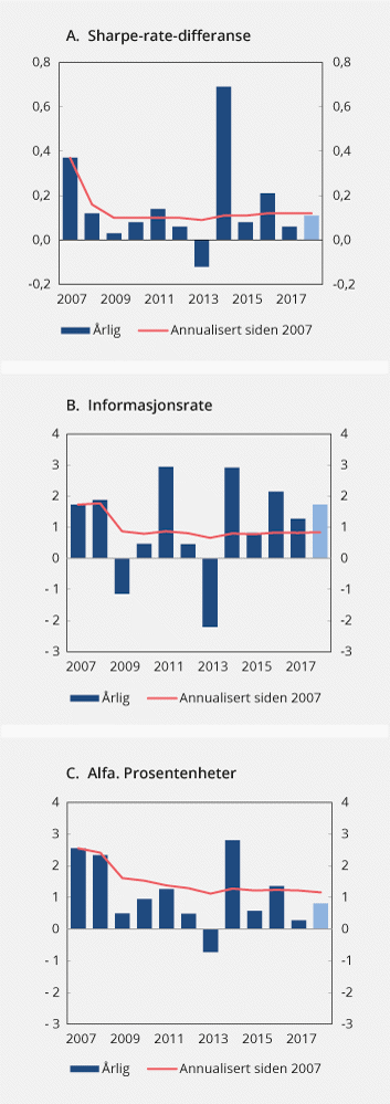 Sharpe-raten måler forholdet mellom avkastningen av SPN utover en risikofri plassering av kapitalen og den absolutte risikoen i fondet. I 2018 oppnådde Folketrygdfondet en Sharpe-rate for SPN som var om lag 0,1 høyere enn for referanseindeksen, se tabell 4.2 og figur 4.6A. Det tyder på at Folketrygdfondets forvaltning bidro til et noe bedre forhold mellom avkastning og risiko i SPN sammenlignet med referanseindeksen. Målt over perioden siden januar 2007 er forskjellen mellom Sharpe-raten for SPN og referanseindeksen 0,1. Den høyere Sharpe-raten for SPN sammenlignet med referanseindeksen følger av at Folketrygdfondet over tid har oppnådd meravkastning, samtidig som forvaltningen har bidratt til lavere absolutt risiko i fondet enn i referanseindeksen.