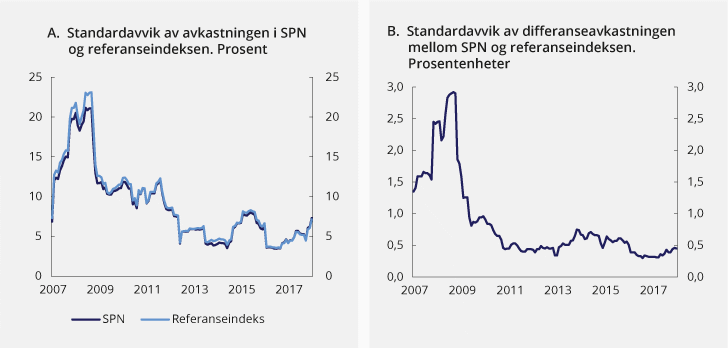 I mandatet for forvaltningen av SPN har Finansdepartementet fastsatt en ramme for avvik fra referanseindeksen på tre prosentenheter, målt ved forventet relativ volatilitet. Utnyttelsen av rammen for avvik fra referanseindeksen har vært relativt lav de siste årene. Ved utgangen av september 2018 var forventet relativ volatilitet om lag 0,6 prosentenheter i SPN, om lag tilsvarende som gjennomsnittlig rammeutnyttelse i perioden januar 2015 – september 2018. Folketrygdfondet påpeker at endringer i porteføljen og referanseindeksen, samt endringer i markedsvolatilitet og samvariasjon mellom sektorer, har bidratt til at relativ risiko har falt i perioden etter 2009. I strategisk plan viser Folketrygdfondets styre til at forventet relativ volatilitet normalt vil være i intervallet 0,5 til 1,5 prosentenheter.