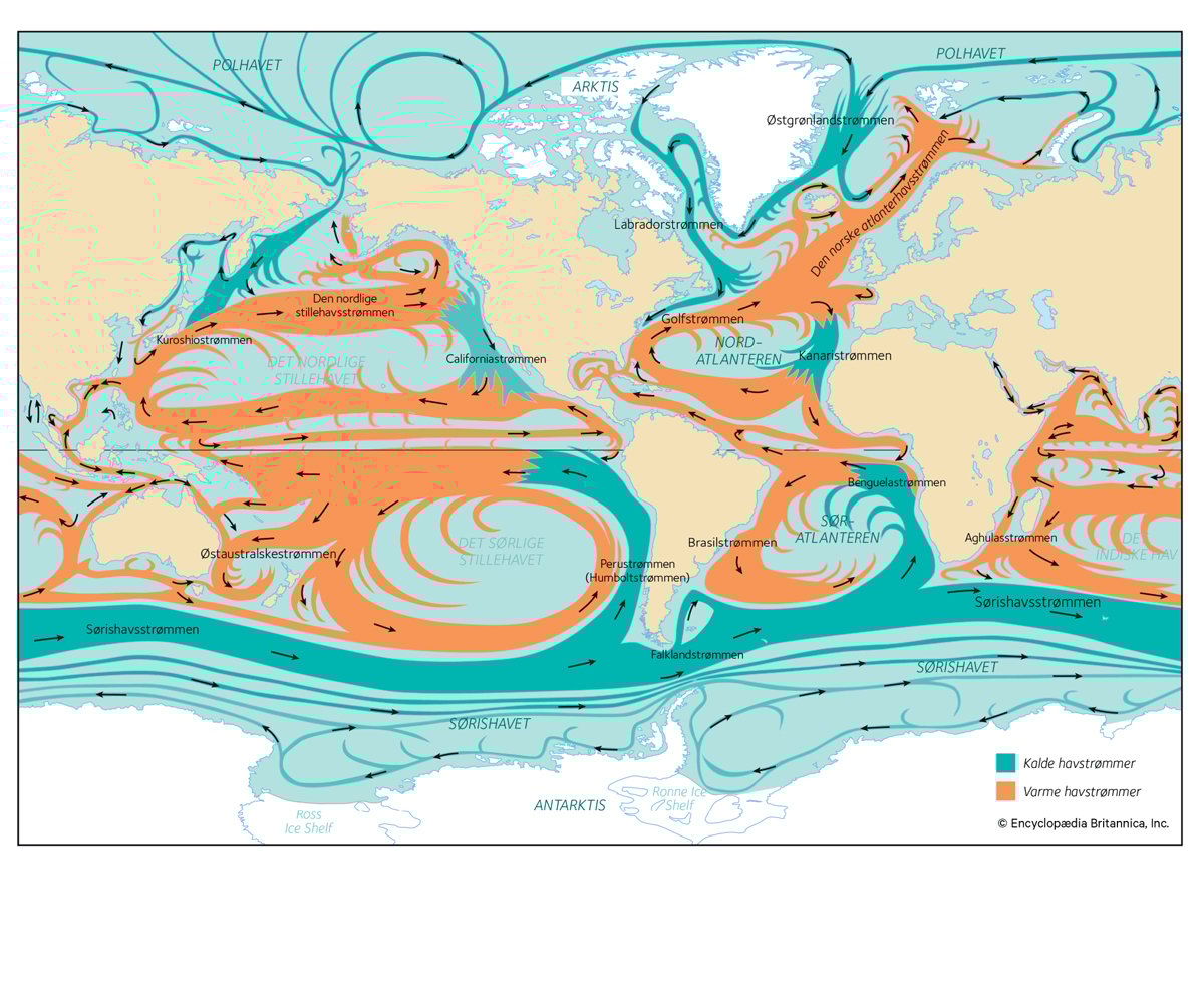 Figur 4.1 Havstrømmer i verdenshavene. Norske havområder er en del av et sammenhengende havsystem og kretsløp.