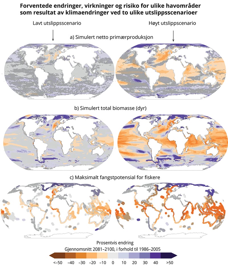 Globalt forventes det at den biologiske produksjonen i verdenshavene vil synke etterhvert som havet blir varmere: Nedgangen vil være størst i tropiske havområder (figur 4.3). Samtidig vil artenes leveområder forskyves mot polene. Havvannet vil bli stadig surere etter hvert som det tar opp mer CO2. Dette vil føre til store endringer i de marine økosystemene. Klimapanelet har beregnet at det globale fangstpotensialet for fisk kan bli redusert med opptil 25 prosent i 2100, hvis utslippene av klimagasser ikke reduseres. Også denne nedgangen vil bli størst i tropene. For polare havområder forventes det at endringene i fangstpotensial vil variere, og for enkelte områder kan endringene bli positive, (figur 4.3).