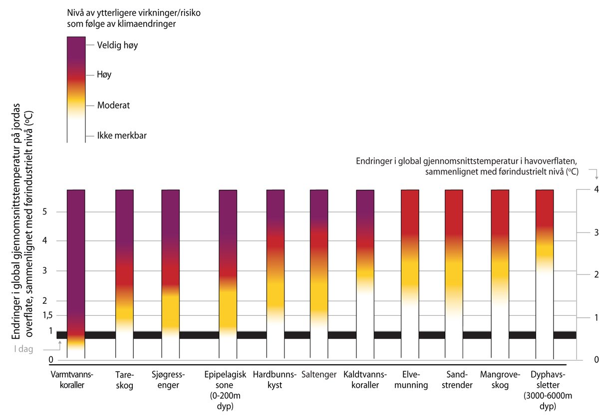 Klimapanelets rapport viser at det er hav- og kystområdene på lavere breddegrader som rammes hardest. Men også viktige marine økosystemer som finnes i norske farvann er sårbare for temperaturøkning og havforsuring. Dette gjelder blant annet tareskoger, sjøgressenger, kaldtvannskoraller og økosystemer knyttet til havisen i Arktis. Figur 4.4 viser sårbarheten til ulike kystnære marine økosystemer for klimaendringer.