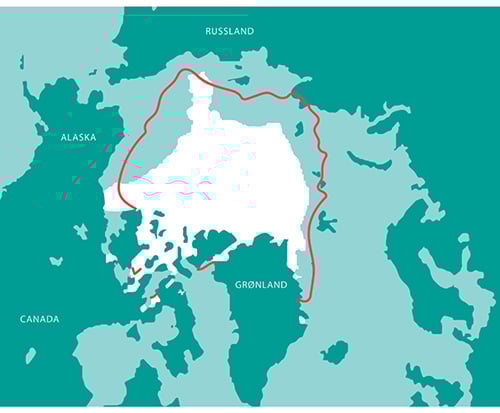 Figur 4.5 Kartet viser isutbredelse i Arktis (hvitt område) september 2018. Den røde linjen viser gjennomsnittet for isutbredelsen for september fra 1981 til 2010. Basert på satellittbilder og havisindeksen til amerikanske National Snow & Ice Data Center.