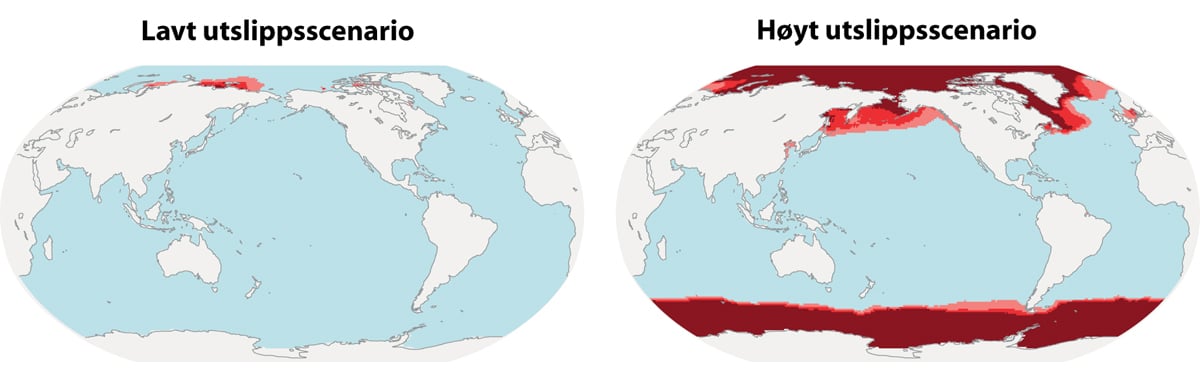 Figur 4.6 Forventet global fordeling av havforsuring mot slutten av århundret. Rød farge indikerer områdene med den største forventede havforsuringen. Figuren til venstre viser et scenario med lave klimagassutslipp (RCP2.6) og figuren til høyre viser et høyt utslippscenario (RCP 8.5). Figurene viser anslått havforsuring målt som kalkmetning (aragonitt) i øvre vannlag i år 2081–2100. Surere havvann med lav metning av aragonitt kan påvirke viktige marine arter som er avhengige av kalk for å bygge skjelett eller skall negativt, og dermed endre de marine økosystemene.