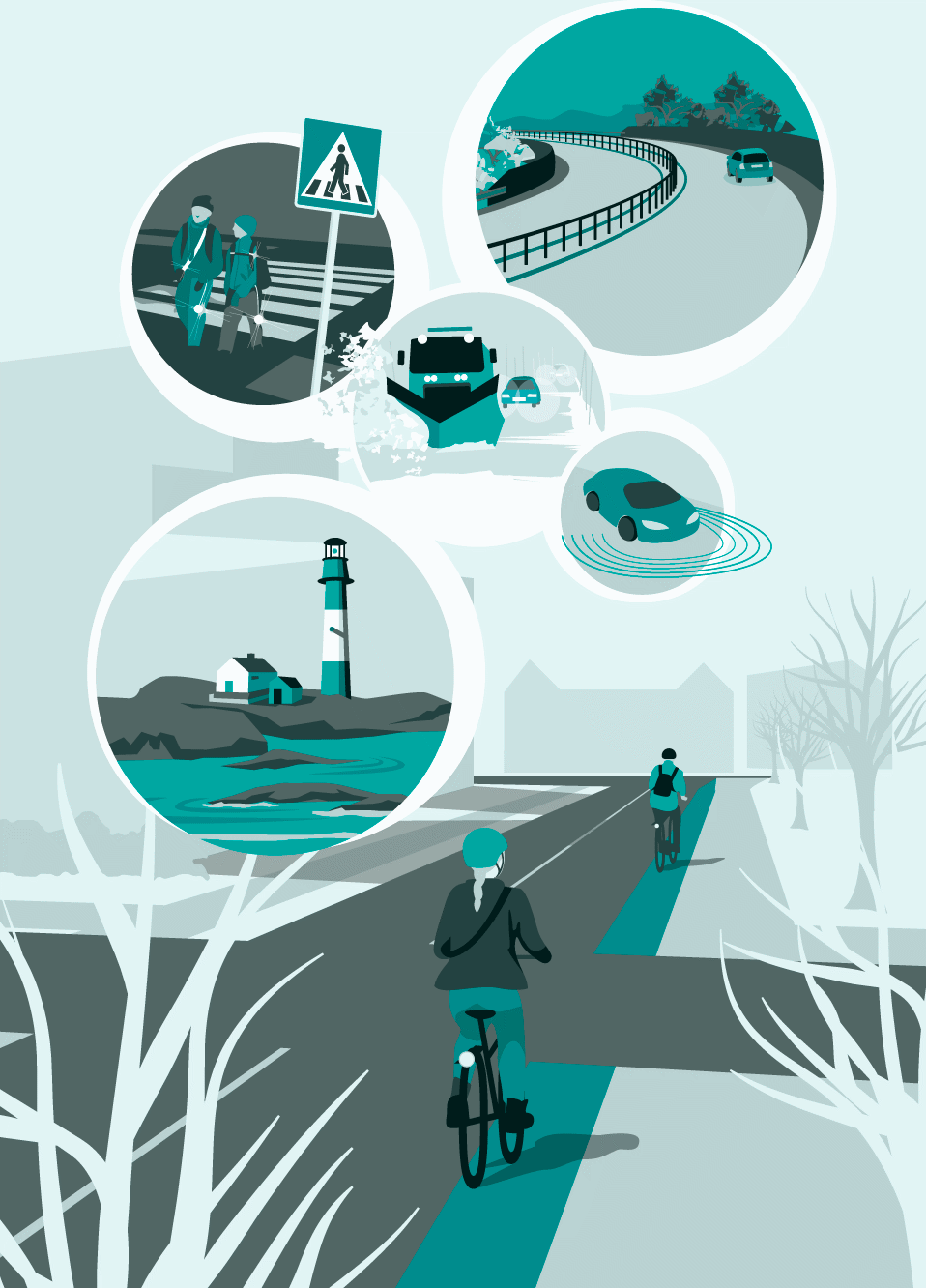 Synstolkning: Illustrasjoner som viser bil på vei med midtrekkverk, barn med refleks som benytter gangfelt, brøytebil, bil med sensorteknologi, fyrtårn og syklister med sykkelhjelm.