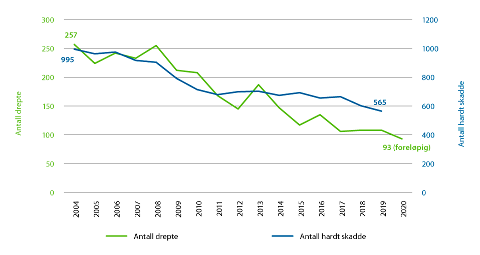 Synstolking: Figuren viser fall i antall drepte og hardt skadde i trafikken fra 2004 til og med 2020. Tallet på drepte har gått ned fra 257 til 93 i perioden, mens tallet på hardt skadde har gått ned fra 995 til 565 i 2019.