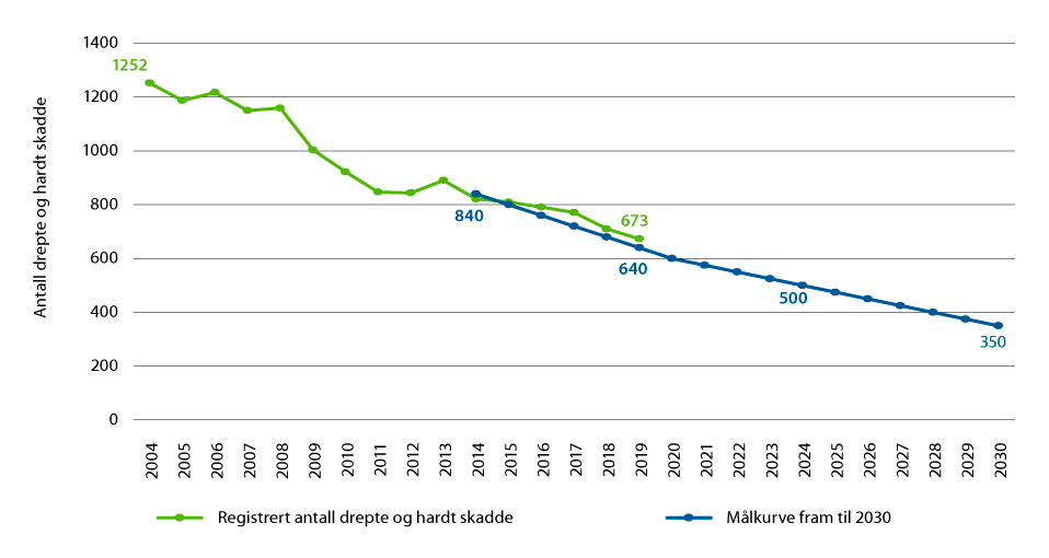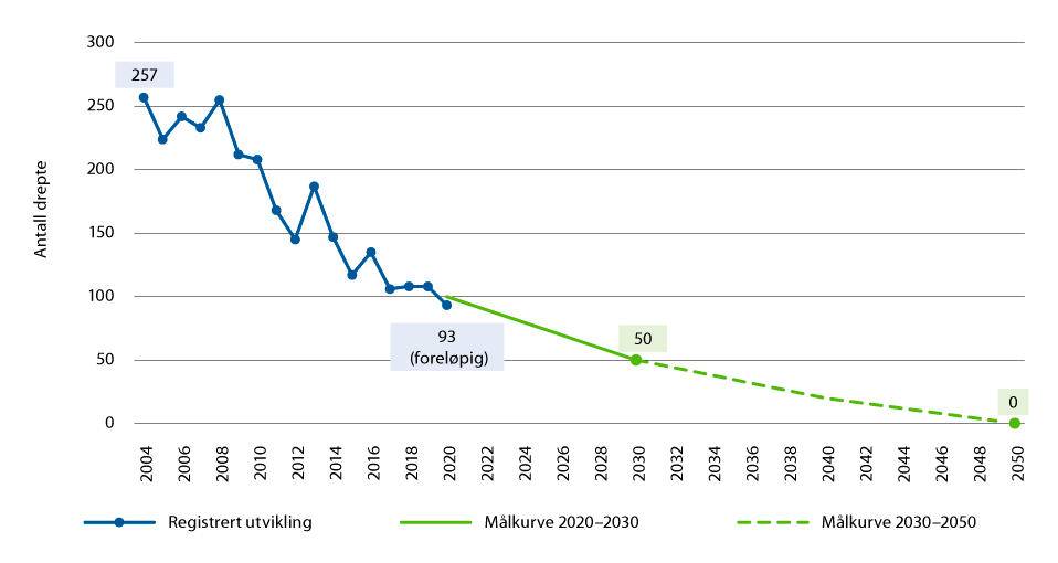 «Innen 2030 skal det maksimalt være 350 drepte og hardt skadde i veitrafikken, hvorav maksimalt 50 drepte. Ingen skal omkomme i veitrafikken i 2050.»
